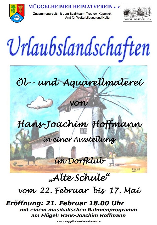 Eine Ausstellung mit den Werken von Hans-Joachim Hoffmann mit dem Thema Urlaubslandschaften in Öl- oder Aquarellmalerei. Die Eröffnungsveranstaltung findet am 21.02.2013 um 17:00 Uhr statt. Herr Hoffmann wird am Flügel ein musikalisches Rahmenprogramm bieten. Ansonsten ist die Ausstellung vom 22.02.2013 bis zum 17.05.2013 im Dorfklub "Alte Schule" zu betrachten.