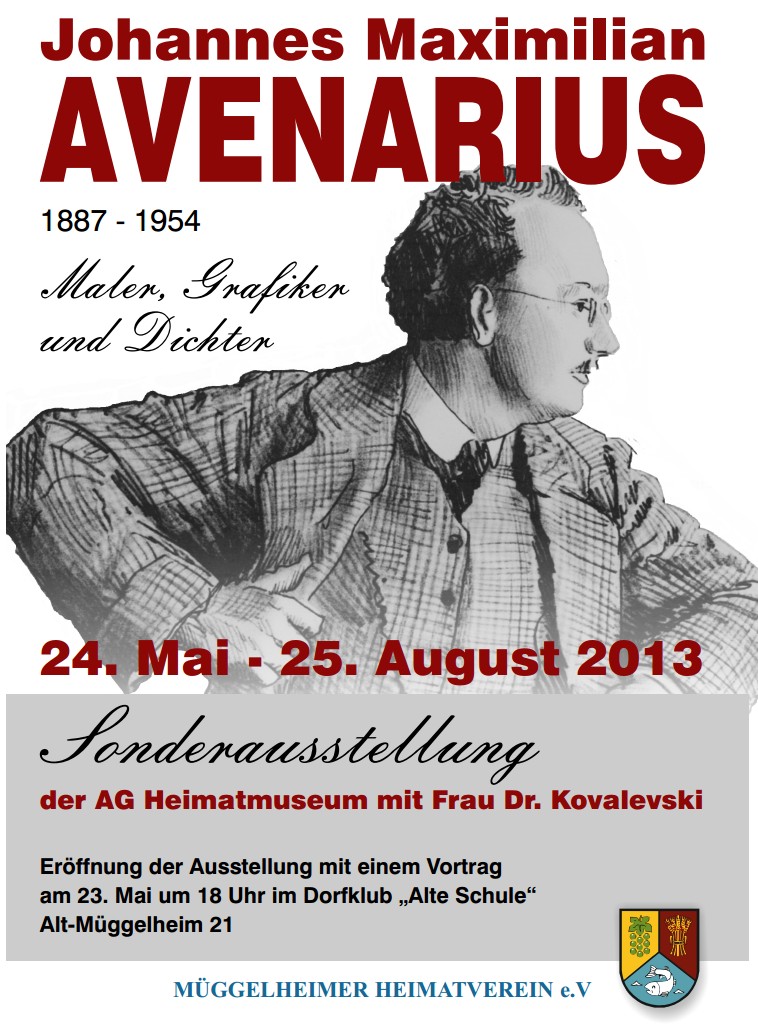 Die AG Heimatmuseum des Heimatvereins eröffnet am 23. Mai 2013 um 18.00 Uhr mit einem Vortrag von Frau Dr. Kovalevski eine Ausstellung, die dem Maler, Grafiker und Dichter Johannes Maximilian Avenarius (1887 – 1954) gewidmet ist und Einblick in dessen Schaffen gibt. In seinem Elternhaus in Greiffenberg/Schlesien wurden Wissenschaft und Kunst gepflegt. Avenarius konnte in Dresden und München an den Kunstakademien studieren und seit 1910 arbeitete er freischaffend für Buchillustrationen und schuf Gemälde für Kirchen. 1922 erhielt er den Auftrag von dem Dichter Gerhard Hauptmann, in dessen Haus „Wiesenstein“ in Agnetendorf Wandmalereien auszuführen, die Themen aus Werken Hauptmanns zum Inhalt haben. Diese Bilder im lebensfrohem Jugendstil, das „Schlesisches Paradies“ genannt, machten Avenarius bekannt, er erhielt weitere Aufträge in Göteborg, Berlin und Wien. Der Krieg setzte eine traurige Zäsur, die Ausweisung des Ehepaares Avenarius aus ihrem Haus in Schlesien und die Umsiedlung nach Berlin-Müggelheim. Hier malte Avenarius Bilder religiöser Thematik und setzte sich besonders für das Gedenken an den Dichter Gerhard Hauptmann ein. So schuf er Illustrationen zu dem Gedicht von Hauptmann „Harut und Marut“, die in der Druckerei Walter Arnoldi in Müggelheim gedruckt wurden. Professor Johannes Maximilian Avenarius verstarb am 21. August 1954 in Müggelheim.