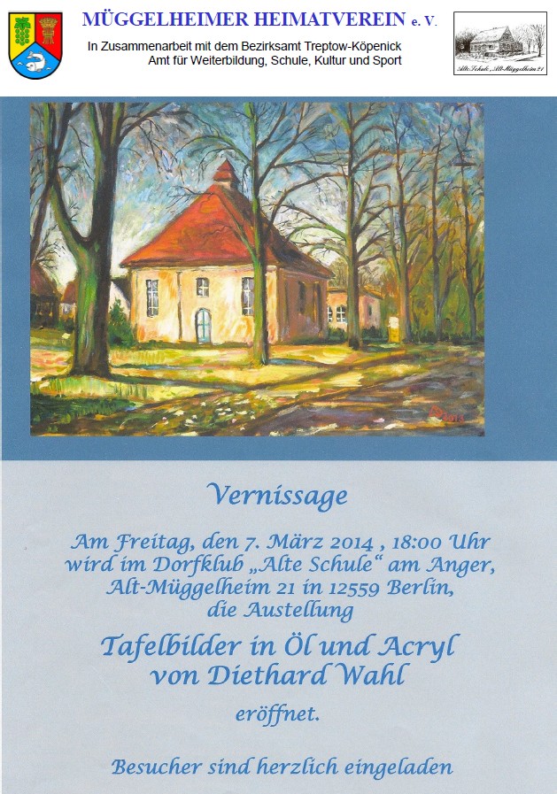 Am Freitag, den 7. März 2014, 18:00 Uhr wird im Dorfklub "Alte Schule" am Anger, Alt-Müggelheim 21 in 12559 Berlin Tafelbilder in Öl und Acryl von Diethard Wahl eröffnet. Besucher sind herzlich eingeladen.