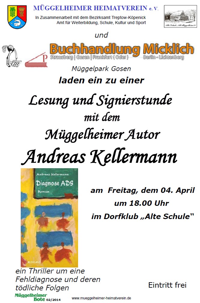 Der Müggelheimer Heimatverein und die Buchhandlung Micklich laden zu einer Lesung und Signierstunde mit dem Müggelheimer Autor Andreas Kellermann am Freitag, dem 4. April um 18:00 Uhr im Dorfklub Müggelheim. Diagnose ADS, ein Thriller um eine Fehldiagnose und deren tödliche Folgen.