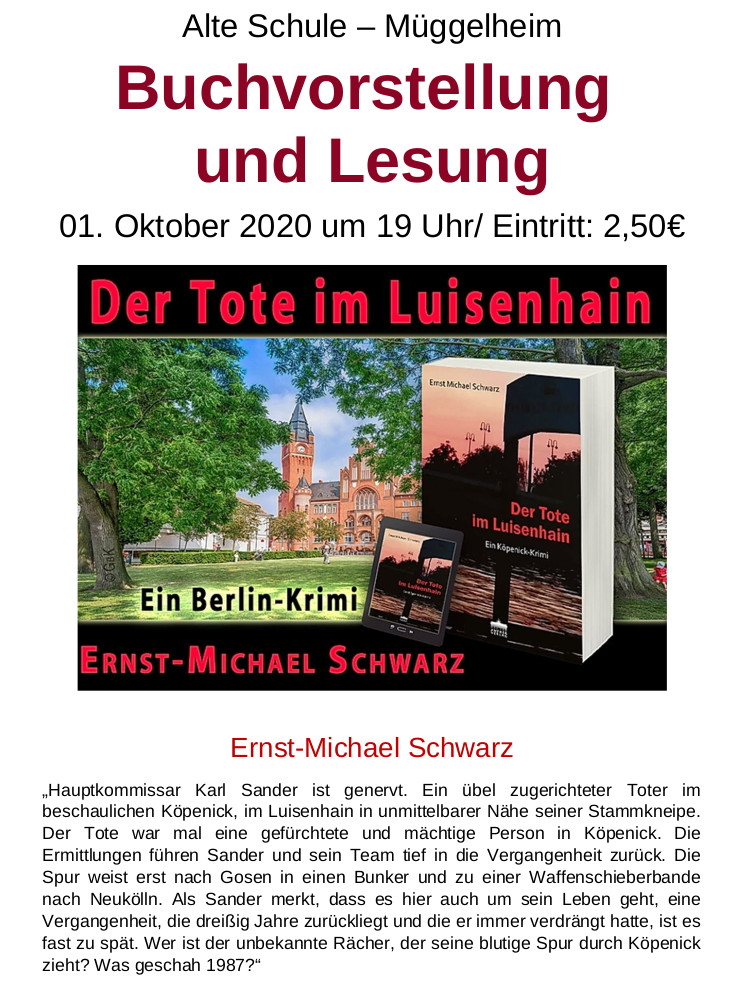 Am 01. Oktober 2020 um 19:00 Uhr liest der Autor im Dorfklub "Alte Schule" in Müggelheim aus seinem neuen Buch.
