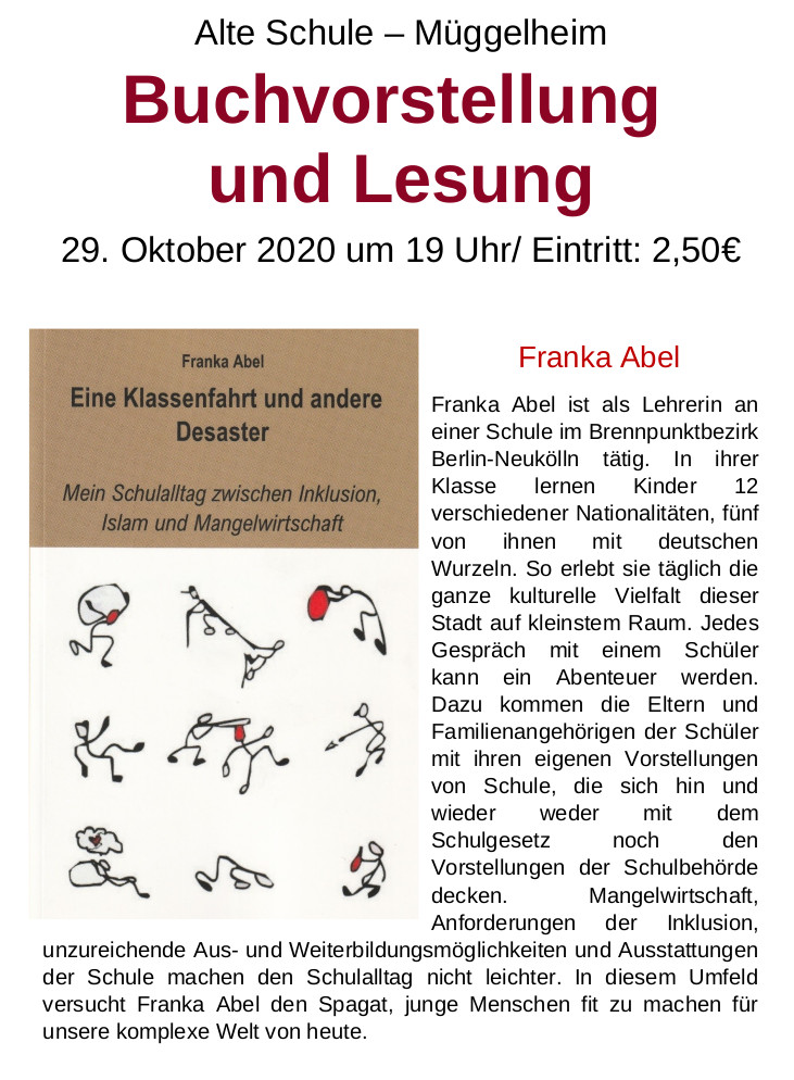 Frau Franka Abel stellt ihr Buch "Eine Klassenfahrt und andere Desaster“ vor. Franka Abel ist als Lehrerin an einer Schule im Brennpunktbezirk Berlin-Neukölln tätig. In ihrer Klasse lernen Kinder 12 verschiedener Nationalitäten, fünf von ihnen mit deutschen Wurzeln. So erlebt sie täglich die ganze kulturelle Vielfalt dieser Stadt auf kleinstem Raum. Jedes Gespräch mit einem Schüler kann ein Abenteuer werden. Dazu kommen die Eltern und Familienangehörigen der Schüler mit ihren eigenen Vorstellungen von Schule, die sich hin und wieder weder mit dem Schulgesetz noch den Vorstellungen der Schulbehörde decken. Mangelwirtschaft, Anforderungen der Inklusion, unzureichende Aus- und Weiterbildungsmöglichkeiten und Ausstattungen der Schule machen den Schulalltag nicht leichter. In diesem Umfeld versucht Franka Abel den Spagat, junge Menschen fit zu machen für unsere komplexe Welt von heute.