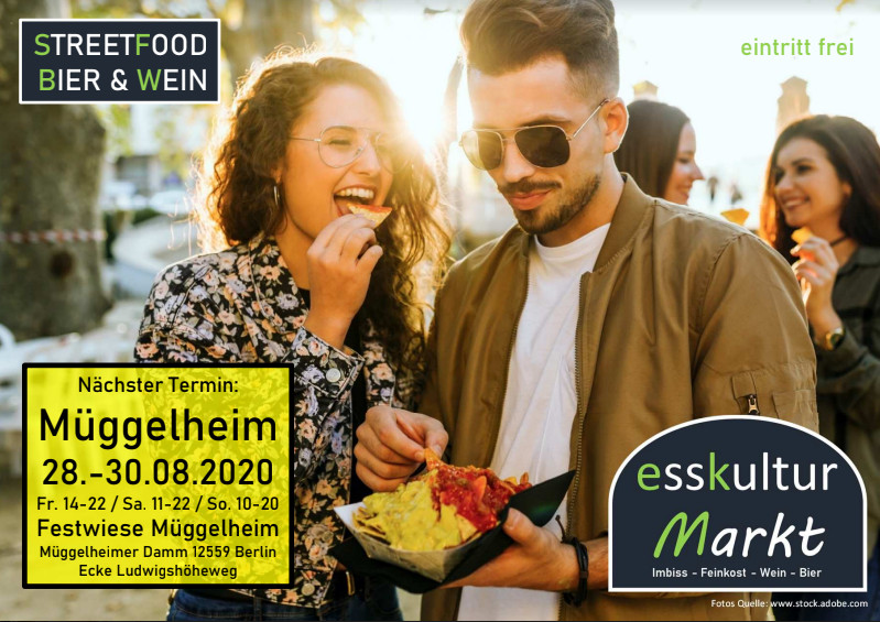 Wir freuen uns sehr Ihnen endlich wieder eine Veranstaltung in Müggelheim präsentieren zu können. Am Wochenende vom 28.08. bis zum 30.08. findet auf unserer Kirchenwiese am Ortseingang von Müggelheim der "esskultur Markt" statt. Hier veranstaltet Jüttner Enterntainment mit Unterstützung des Heimatvereins eine Veranstaltung die uns Streetfood, Feinkost bei Bier und Wein näher bringen soll. Wir freuen uns auf Ihren Besuch.