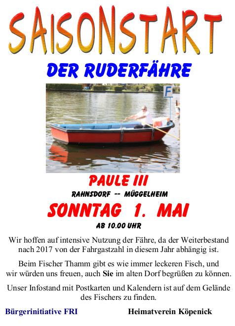 Wir hoffen auf intensive Nutzung der Fähre, da der Weiterbestand nach 2017 von der Fahrgastzahl in diesem Jahr abhängig ist. Beim Fischer Thamm gibt es wie immer leckeren Fisch, und wir würden uns freuen, auch Sie im alten Dorf begrüßen zu können. Unser Infostand mit Postkarten und Kalendern ist auf dem Gelände des Fischers zu finden.